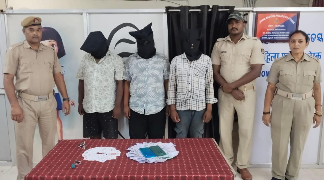 ଜୋଙ୍କ ଥାନା : ମୋବାଇଲ, ବାଇକ ଓ ଟଙ୍କା ଜବତ,ତିନ ଯୁଆଡ଼ି ଗିରଫ।