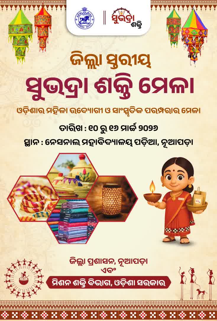 ନୂଆପଡ଼ା -୧୦/୩-(ମାରାଗୁଡ଼ା ଏକ୍ସପ୍ରେସ)ଓଡ଼ିଶା ର ମହିଳା ଉଦ୍ୟୋଗୀତା ସହିତ ସାଂସ୍କୃତିକ ପରମ୍ପରାକୁ ଆଗେଇ ନେବା ଉଦ୍ଦେଶ୍ୟରେ ଜିଲ୍ଲା ପ୍ରଶାସନ, ନୂଆପଡ଼ା ଓ ଓଡ଼ିଶା ସରକାରଙ୍କ ମିଶନ ଶକ୍ତି ବିଭାଗର ଆନୁକୂଲ୍ୟରେ ଜିଲ୍ଲା ସ୍ତରୀୟ “ସୁଭଦ୍ରା ଶକ୍ତି ମେଳା” ମାର୍ଚ୍ଚ ୧୦ ରୁ ୧୬ ତାରିଖ ପର୍ଯ୍ୟନ୍ତ ନୂଆପଡ଼ା ସ୍ଥିତ ନେସନାଲ ମହାବିଦ୍ୟାଳୟ ପଡ଼ିଆରେ ଆୟୋଜିତ ହେବ। ଆଜି ମେଳାର ପ୍ରଥମ ଦିବସ ୧୦ ମାର୍ଚ୍ଚ ୨୦୨୬ ରେ ଆୟୋଜିତ ଉଦ୍ଘାଟନୀ କାର୍ଯ୍ୟକ୍ରମରେ ଜିଲ୍ଲାପାଳ ମଧୁସୂଦନ ଦାଶ ସଭାପତିତ୍ୱ କରିବେ l ଏଥିରେ ନୂଆପଡ଼ା ଜିଲ୍ଲା ପରିଷଦ ଅଧ୍ୟକ୍ଷା, ଶ୍ରୀମତୀ ଡଲି ମାଝୀ ମୁଖ୍ୟ ଅତିଥି ଭାବରେ ଯୋଗଦେବେ। ସମାରୋହରେ ନୂଆପଡ଼ା ଆରକ୍ଷୀ ଅଧିକ୍ଷକ, ଅମ୍ରିତପାଲ ସିଂ, ବନଖଣ୍ଡ ଅଧିକାରୀ (ପ୍ରାନ୍ତୀୟ) ଖଡିଆଳ, ଅଜିଜ ଖାନ, ନୂଆପଡ଼ା ପଞ୍ଚାୟତ ସମିତି ଅଧ୍ୟକ୍ଷା, ଶ୍ରୀମତୀ ତାରେଶ୍ୱରୀ ସାହୁ, ଖରିଆର ରୋଡ଼ ବିଜ୍ଞାପିତ ଅଞ୍ଚଳ ପରିଷଦ ଅଧ୍ୟକ୍ଷା, ଡଃ ସୋନିଆ ଜୈନ ଓ ଜିଲ୍ଲା ପରିଷଦ ସଭ୍ୟା, ଶ୍ରୀମତୀ ଉମା ଠାକୁର ସମ୍ମାନିତ ଅତିଥି ଭାବରେ ଯୋଗଦେବେ।