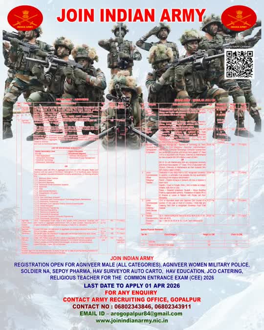 ନୂଆପଡା -୧/୩ ସେନା ନିଯୁକ୍ତି କାର୍ଯ୍ୟାଳୟ, ଗୋପାଳପୁର ତରଫରୁ ଜଣାଇ ଦିଆଯାଇଛି ଯେ,ଭାରତୀୟ ସେନାରେ ଯୋଗ ଦେବାକୁ ଇଚ୍ଛୁକ ଥିବା ନୂଆପଡା ଜିଲ୍ଲା ସମେତ ଦକ୍ଷିଣ ଓଡ଼ିଶାର ଯୁବକ ଯୁବତୀ ମାନଙ୍କ ପାଇଁ ଏକ ସୁବର୍ଣ୍ଣ ସୁଯୋଗ ଅଛି। ଗୋପାଳପୁର ସେନା ନିଯୁକ୍ତି କାର୍ଯ୍ୟାଳୟ (ARO Gopalpur) ପକ୍ଷରୁ ନିଯୁକ୍ତି ବର୍ଷ ୨୦୨୬-୨୭ ପାଇଁ ‘ଅଗ୍ନିପଥ ଯୋଜନା’ ଏବଂ ‘ନିୟମିତ କ୍ୟାଡର’ ନିମନ୍ତେ ଅନଲାଇନ୍ ପଞ୍ଜିକରଣ ପ୍ରକ୍ରିୟା ଆରମ୍ଭ ହୋଇଛି।ପଞ୍ଜିକରଣ ଅବଧି: ୧୩ ଫେବୃଆରୀ ୨୦୨୬ ରୁ ୦୧ ଏପ୍ରିଲ ୨୦୨୬ ପର୍ଯ୍ୟନ୍ତ ରହିଛି।