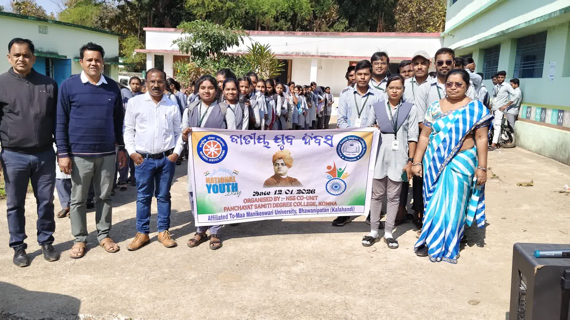 ନୂଆପଡ଼ା ୧୨/୦୧ (ମାରାଗୁଡା ଏକ୍ସପ୍ରେସ) – ପଞ୍ଚାୟତ ସମିତି ସ୍ନାତକ ମହାବିଦ୍ୟାଳୟ କୋମନାର ଏନ୍.ଏସ୍.ଏସ୍. କାର୍ଯ୍ୟକ୍ରମ ଅଧିକାରୀ ନଳିନୀ କାନ୍ତି ସା ଙ୍କ ଅଧ୍ୟକ୍ଷତା ରେ ଆଜି ମହାବିଦ୍ୟାଳୟରେ ଜାତୀୟ ଯୁବ ଦିବସ ପାଳନ କରାଯାଇଥିଲା। ସମସ୍ତ ଅଧ୍ୟାପକ ଅଧ୍ୟାପିକା ଙ୍କ ସହିତ ସମସ୍ତ ଏନ୍. ଏସ୍. ଏସ୍. ସ୍ଵେଚ୍ଛାସେବୀ ଉପସ୍ଥିତ ରହିଥିଲେ ଓ ବଂନ୍ଦେ ମାତରମ୍ ସଙ୍ଗୀତ ସାମୁହିକ ଗାନ କରାଯାଇଥିଲା ଏବଂ ଏହି ଅବସରରେ ଏକ ଶୋଭାଯାତ୍ରା ମଧ୍ୟ ପରିଭ୍ରମଣ କରିଥିଲା। ଉପରୋକ୍ତ କାର୍ଯ୍ୟକ୍ରମ ରେ ଅମିତ୍ ରାଉତ ଲକ୍ଷ୍ମଣ ଥପା , ଡୋଲା ମଣି ଭୋଇ ,ବିଜୟ କୁମାର ବାଗ , ବିମଲ୍ ସାହୁ, ପ୍ରମୁଖ ସହଯୋଗ କରିଥିଲେ।
